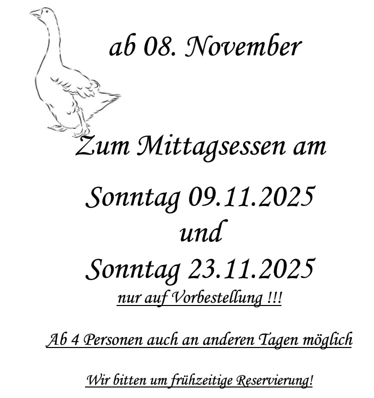 Die gemütliche Jahreszeit ist da – und damit auch unser traditionelles Gansessen. Freuen Sie sich auf knusprig gebratene Gans mit leckeren Beilagen, frisch für Sie zubereitet und in angenehmer Atmosphäre serviert. Ob mit Familie, Freunden oder Kollegen – hier wird es festlich und genussvoll.
